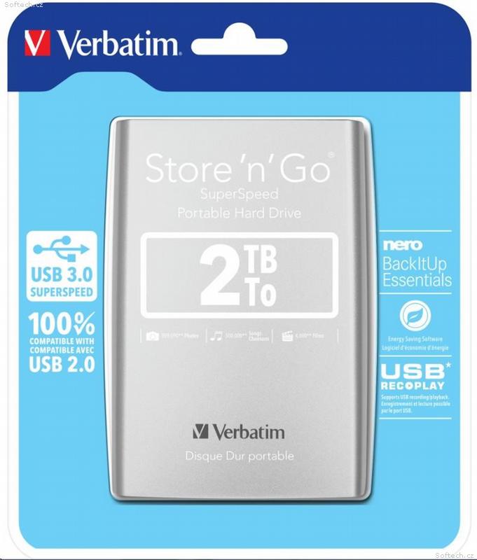 Přenosný pevný disk Verbatim Store n Go nabízí velkokapacitní úložiště s rozhraním USB 3.0 Super Speed. Rozhraní USB 3.0 nabízí až desetkrát rychlejší přenos dat než USB 2.0 (podle rychlosti sběrnice USB), takže umožňuje extrémně rychlý přenos dat na cestách.