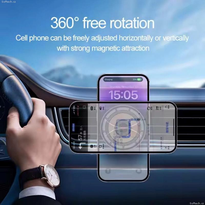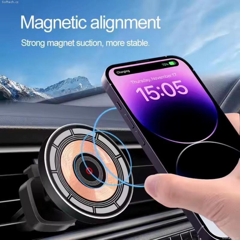 Q22 CAR Kvalitní hliníková výkonná bezdrátová magnetická nabíječka do auta s podporou Apple MagSafe. Vybavená držákem do ventilace, v atraktivním černo transparentním designu.