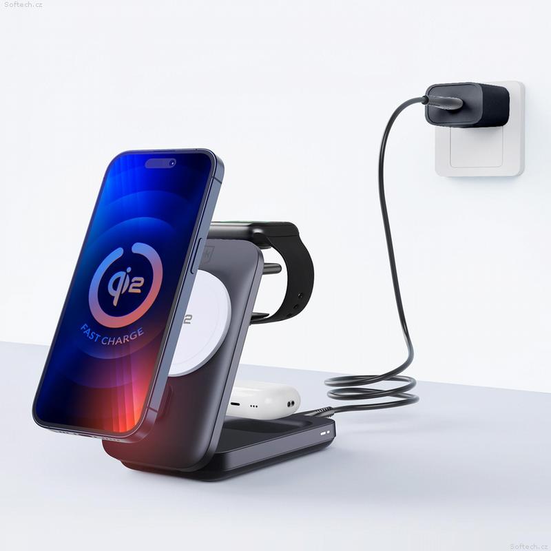 3mk bezdrátová nabíječka - MagRocket 3-in-1, technologie Qi2, 15W, černá