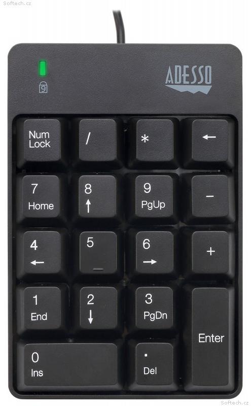 Externí numerická klávesnice odolná proti polití tekutinou pro rychlé a pohodlné zadávání číselných údajů do PC či notebooku. Připojení k počítači je realizováno skrze 1,8 m dlouhý kabel zakončený USB konektorem.