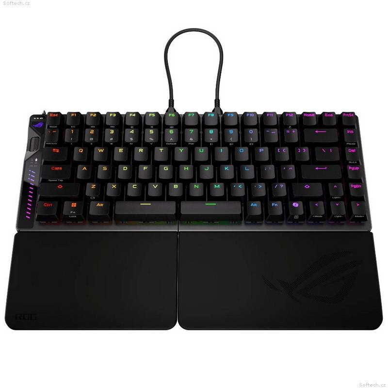 Herní klávesnice ROG Falcata 75 % s rozdělenou klávesnicí, magnetickými spínači ROG HFX V2 s možností výměny za provozu a snímačem ROG Hall Sensor; vybavená přepínačem Rapid Trigger, intuitivním ovládáním a multifunkčním kolečkem, třírežimovým připojením s bezdrátovou technologií ROG SpeedNova 8K, režimem Zone Mode, čtyřvrstvým tlumení a odnímatelnými silikonovými opěrkami zápěstí