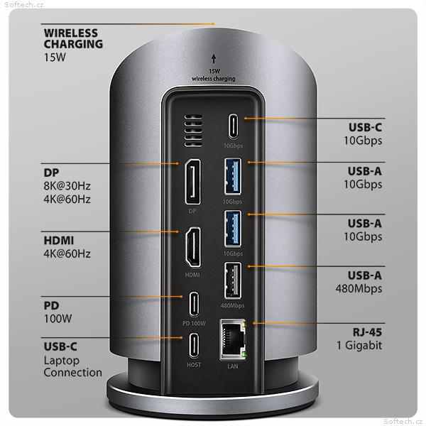 Multiportový USB-C 10Gbps AXAGON HMC-WL9 WIRELESS CHARGING 9in1 hub rozšíří váš notebook, počítač nebo telefon o dva video výstupy, LAN konektor, USB porty a bezdrátovou nabíječku. Váš notebook připojíte k hubu přes 60 cm dlouhý USB-C kabel. Okamžitě tak máte k dispozici připojení pro dva 4K monitory, čtyři USB zařízení a konektor RJ-45 pro Gigabitovou Ethernet síť. Zároveň získáte možnost napájení notebooku pomocí technologie Power Delivery. Díky kompatibilitě s rozhraním Thunderbolt 3/4/5 můžete dokovací stanici 9v1 použít i s notebooky, jako jsou například Apple MacBook Air nebo MacBook Pro.
