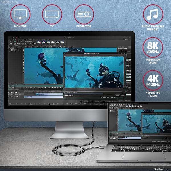 Kabel podporuje přenos dat rychlostí až 40 Gb/s, také umožňuje přenášet obraz až do rozlišení 8K/60Hz Full Ultra HD a zvuk.