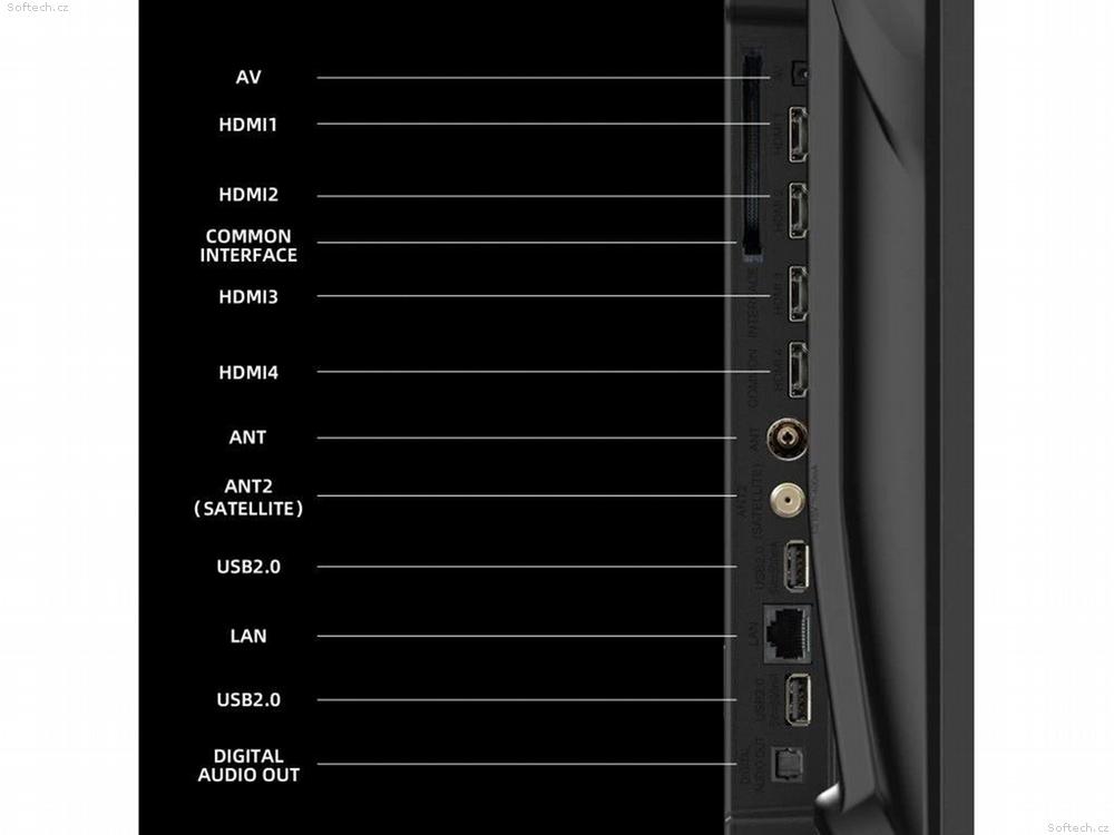 AV vstup mini, CI+, digitální audio výstup, HDMI 2.1, USB 2.0, LAN, antény RF a LNB