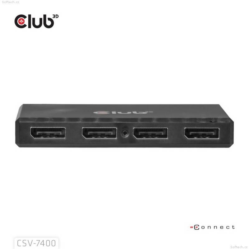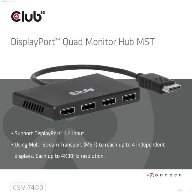 Club 3D CSV-7400 ti umožní připojit až čtyři displeje z jednoho DisplayPort zdroje. Podporuje současný výstup čtyř obrazovek v rozlišení 4K při 30 Hz, díky čemuž je ideálním řešením pro multitasking, vyšší produktivitu nebo rozšířený pracovní prostor.
