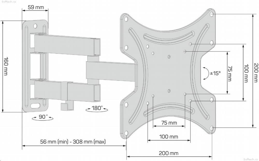Rozměry držáku při maximální vzdálenosti od stěny (š x v x h): 220 x 220 x 308 mm