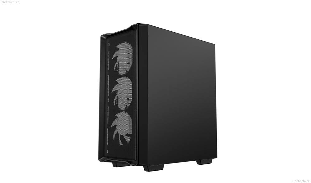 Skříň formátu Middle Tower s průhlednou bočnicí a perforovaným předním panelem nabízí dvě 2,5" pozice pro SSD disky a dvě 3,5" pozice pro pevné disky. Na horním panelu se nachází dva USB 3.0 porty a kombinovaný port sluchátek a mikrofonu. Skříň je osazena celkem čtyřmi ventilátory s ARGB podsvícením o velikosti 120 mm. Důmyslné řešení umožňuje pohodlné umístění až 360 mm dlouhého výměníku vodního chlazení na přední straně. Ve skříni je dostatek prostoru pro chladič CPU do výšky až 165 mm a grafickou kartu o délce 370 mm. Dodávána je bez zdroje. Součástí je také prachový filtr.