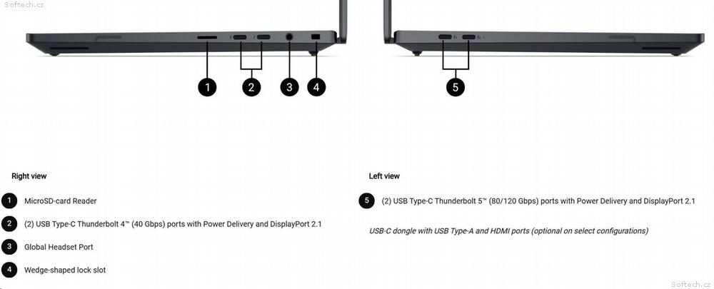 Konektivita: Intel Wi-Fi 7 BE201, Bluetooth 5.4, Thunderbolt 5, Thunderbolt 4, microSD slot
