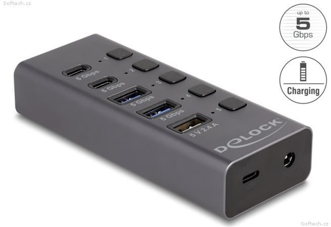 Delock - Rozbocovac - 5 Gbps, 1 port pro rychlé nabíjení, + prepínac - 3 x USB + 2 x USB-C - desktop