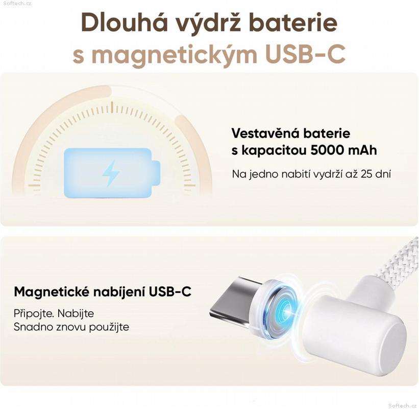 V běžném provozu vydrží až 25 dní. Je vybaven konektorem USB-C s magnetickým adaptérem pro pohodlné nabíjení.