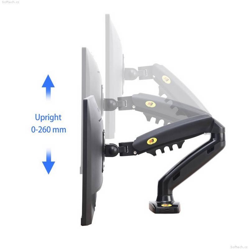 Vynikající stolní držák na monitory, případně menší televize 17-30" v profesionální kvalitě, krásném designu a s mnoha nadstandartními možnostmi nastavení. Otáčení obrazovky do stran, náklon nahoru i dolů ve velkém rozmezí, nastavení vzdálenosti od uchycení až 535mm, korekce roviny obrazovky, horizontální nebo vertikální otočení obrazovky pivot, systém pro skryté vedení kabeláže. Výškové nastavení obrazovky v rozmezí až 260mm díky plynovému pístu - velmi snadná změna výšky pouhým stlačením nebo vytlačením monitoru. To vše v unikátním designu. Držák má velmi odolnou a bezpečnou konstrukci a je vhodný i do velmi vytížených provozů, kde je potřeba neustálé manipulace s monitorem.