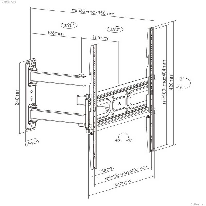 Kvalitní ocelový držák na televize 30-60", nastavení vzdálenosti Tv od zdi 63-358mm, otočný až +/-90°, sklopný +3°/-15°, korekce roviny +/-3°, instalační materiál, záruka 5 let, VESA 100x100 až 400x400, nosnost 35kg