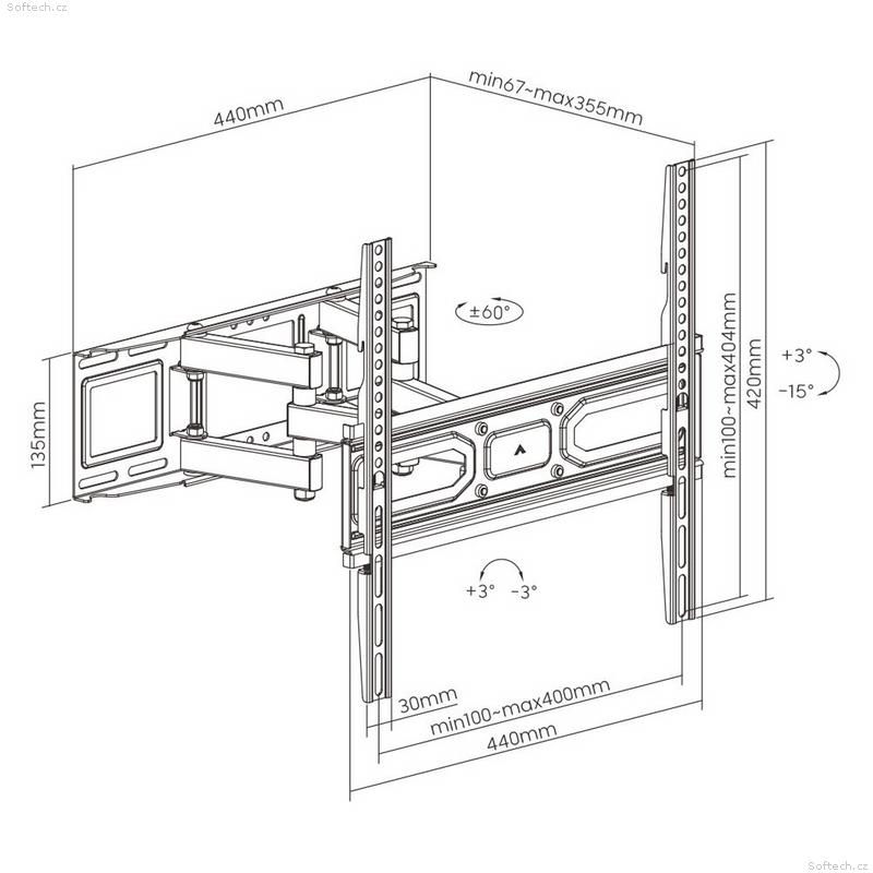 Držák na Tv 30-70", VESA 100x100 až 400x400, otáčení do stran +/-60°, naklápění +3°/-15°, korekce roviny +/-3°, vzdálenost Tv od zdi 67-355mm, pevná a spolehlivá konstrukce s nosností 40kg