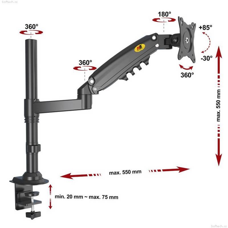 Stolní držák na monitory 17-27", plně polohovatelný, TOP kvalita a design, otáčení do stran, naklápění, vysouvání, PIVOT, VESA 75/100, nosnost 9kg