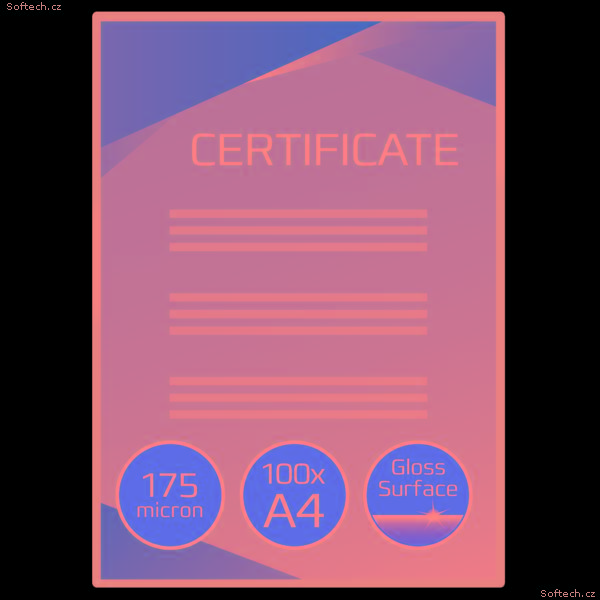 Praktické řešení pro každodenní použití chránící a zdokonalující hodnotné listy prezentací, referenčních seznamů, produktových listů, upozornění apod. Lesklé provedení, tloušťka 2 × 175 mikronů. Formát A4. Balení: 100 kusů. Určené pro dokonalé umístění standardních listů A4 s dostatečnými okraji pro snadné zarovnání listů, zcela voděodolné Vysoký lesk Zvýrazňují a prohlubují tištěné barvy Dlouhodobá odolnost Laminované dokumenty by měly vydržet léta, v závislosti na okolních podmínkách a tloušťce fólie Přizpůsobení velikosti a tvaru listu: laminované dokumenty lze snadno oříznout