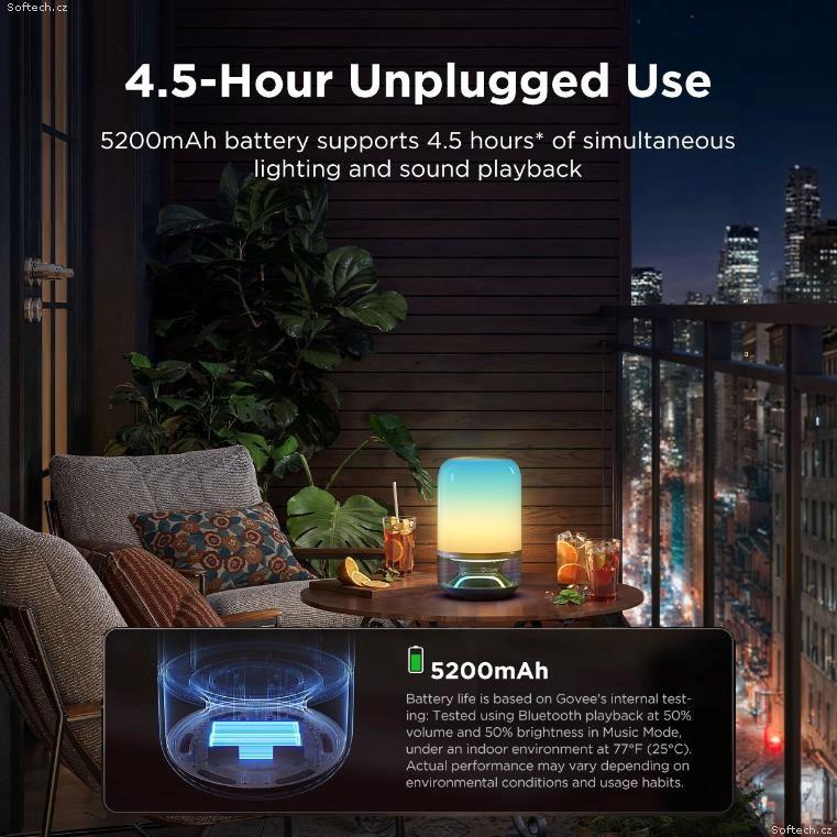 Vestavěná baterie 5200 mAh poskytuje až 4,5 hodiny bezdrátového provozu při polovičním jasu a objemu. Můžete si ji vzít kamkoliv – na zahradu, piknik nebo večírek s přáteli. Nezávislost na zásuvce dává naprostou flexibilitu.