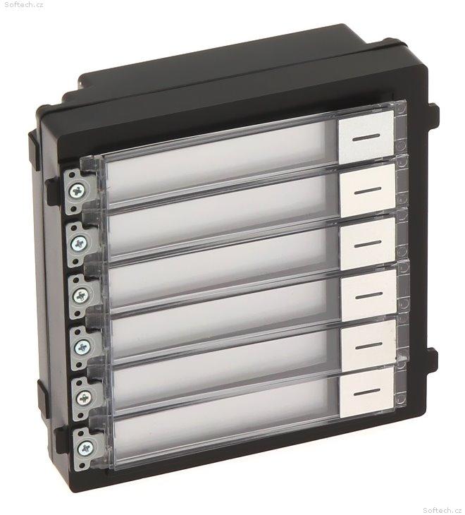 Díky tomuto modulu rozšíříte svůj dveřní systém o dalších 6 tlačítek, díky kterým můžete zvonit jedním stiskem bez potřeby zadávání na numerické klávesnici. Vstupní napájení 12V DC z hlavního modulu je dostupné také na výstupu pro napájení dalších modulů. Spotřeba činí max. 2W. Pro venkovní použití je zařízení certifikováno IP65.