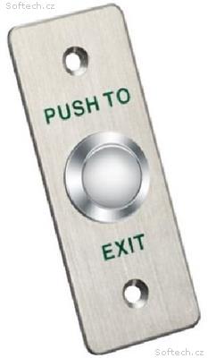 Jednoduché odchodové tlačítko s kontakty NO/NC/COM a rámečkem z leštěného hliníku o celkových rozměrech 90 x 35 x 29mm.