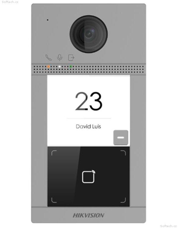 Hikvision IP dveřní interkom s jedním tlačítkem, mikrofonem a reproduktorem pro obousměrnou komunikaci, 2MP kamerou s IR přísvícením, čtečkou karet a čipů s technologií Mifare (13.56MHz), slotem pro microSD karty do kapacity až 128GB, IP65 krytí a ochranou proti vandalům IK08. Interkom neumí napájet dveřní zámky, umí je pouze ovládat pomocí relé.