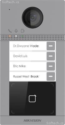 Hikvision IP dveřní interkom se čtyřmi tlačítky, mikrofonem a reproduktorem pro obousměrnou komunikaci, 2MP kamerou s IR přísvícením, čtečkou karet a čipů s technologií Mifare (13.56MHz), IP65 krytím a ochranou proti vandalům IK08. Interkom neumí napájet dveřní zámky, umí je pouze ovládat pomocí relé.