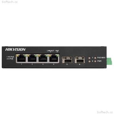 DS-3T0506HP-E/HS je průmyslový 4 portový PoE switch s dvěma SFP moduly bez managementu. První z PoE portů podporuje standary aktivního PoE 802.3af/at/bt s maximálním výstupním výkonem 60W. Další tři porty pak podporují standard aktivního napájení 802.3af/at s maximálním výstupním výkonem 30W. Pro připojení do sítě LAN slouží dvojice SFP slotů. Celkový PoE budget switche činí 60W Zařízení lze napájet pomocí DC adaptéru 48V, který je součástí balení nebo jiným zdrojem s napětím v rozmezí 48 - 57V prostřednictvím svorkovnice.