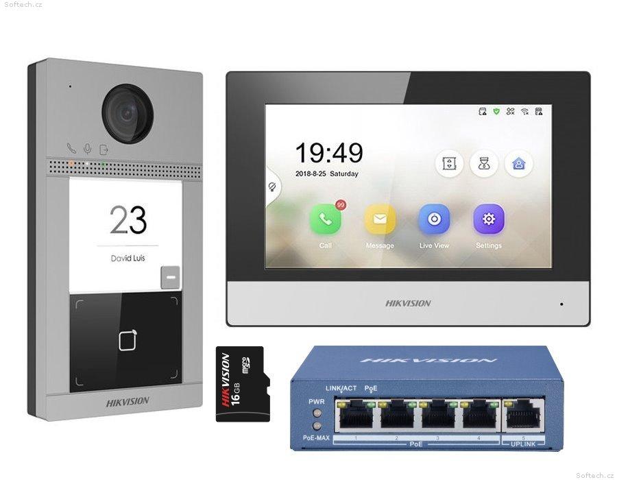 Sada videointerkomu pro IP systém. Součástí je bytový monitor, dveřní stanice (interkom), 5portový PoE switch + napájecí adaptér a paměťová karta 16 GB.