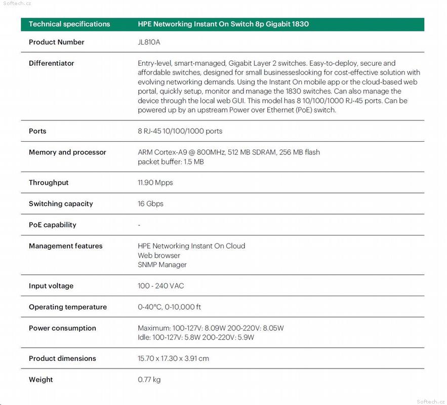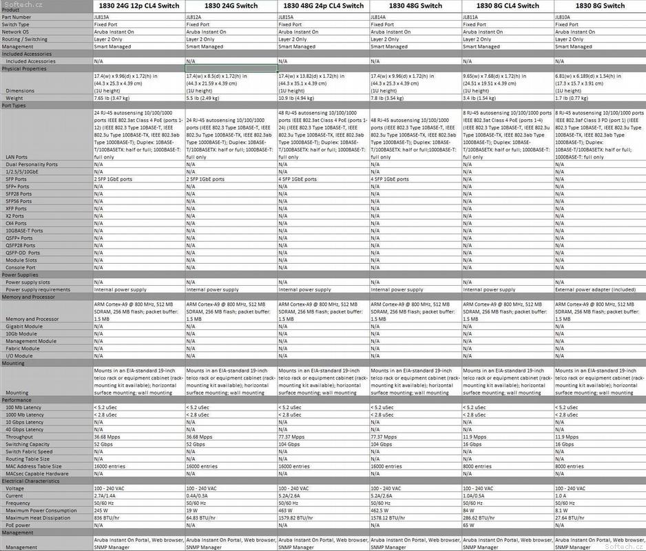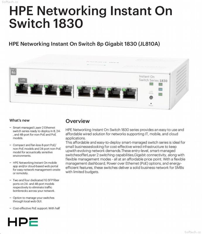 Spravovatelný switch nabízející 8x 10/100/1000 Mbps RJ-45 portů. Na prvním portu je k dispozici PoE vstup pro prostředí, kde není k dispozici síťové napájení. Přepínací kapacita switche je 16 Gbps a rychlost směrování činí 11,9 Mpps. Mezi hlavní přednosti patří podpora Global Storm Control, TPM, snadná tvorba oddělených VLAN, QoS nebo IGMP Snooping. Lze ho položit jen tak na stůl, ale také namontovat pod něj či na zeď. Bezventilátorové provedení zaručuje naprosto tichý chod. Řada Aruba 1830 nabízí uživatelsky přívětivé webové rozhraní či mobilní aplikaci pro snadnou konfiguraci a správu.