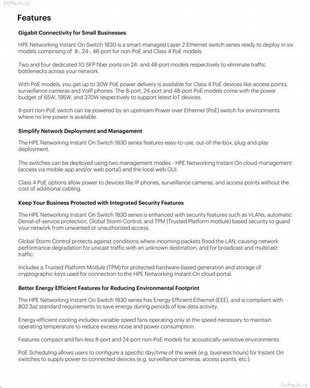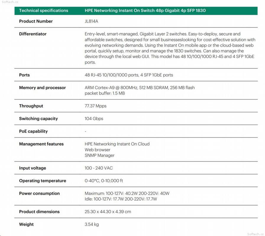 Spravovatelný switch nabízející 48x 10/100/1000 Mbps RJ-45 portů a 4x 1 GbE SFP porty. Přepínací kapacita switche je 104 Gbps a rychlost směrování činí 77,37 Mpps. Mezi hlavní přednosti patří podpora Global Storm Control, TPM, snadná tvorba oddělených VLAN, QoS nebo IGMP Snooping. Lze ho položit jen tak na stůl, namontovat ho na nebo pod něj, na zeď nebo do 19" rackového rozvaděče. Řada Aruba 1830 nabízí uživatelsky přívětivé webové rozhraní či mobilní aplikaci pro snadnou konfiguraci a správu.