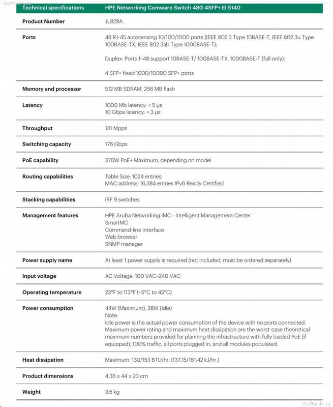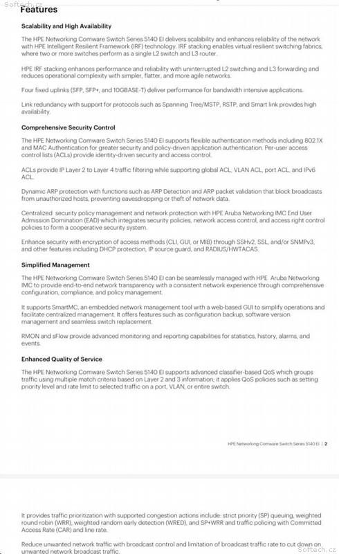 The HPE Networking Comware Switch Series 5140 EI comprises Gigabit Ethernet switches that support static, OSPF and RIP Layer 3 routing, convenient fixed 10GbE uplink ports, PoE+, ACLs, IPv6 and delivers energy savings with Energy Efficient Ethernet. Unique Intelligent Resilient Fabric (IRF) technology creates a virtual fabric by managing several switches as one logical device, which increases network resilience, performance, and availability, while reducing operational complexity. These switches provide Gigabit Ethernet access and can be used at the edge of a network or to connect server clusters in small data centers. High availability, simplified management, and comprehensive security control policies are among the key features that distinguish this series.