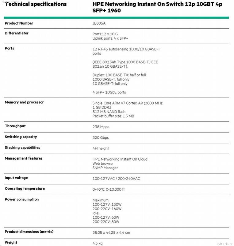 Spravovatelný switch nabízející 12× 10GbE RJ-45 portů a 4× 10G SFP+ porty. Přepínací kapacita switche je 320 Gbps a rychlost směrování činí 238 Mpps. Mezi hlavní přednosti patří snadná tvorba oddělených VLAN, QoS, IGMP Snooping či možnost stohování až 4 switchů. Malým a rostoucím podnikům, které si chtějí svou infrastrukturu řídit samy, nabízí řada Aruba 1960 uživatelsky přívětivé webové rozhraní či mobilní aplikaci pro snadnou konfiguraci a správu.