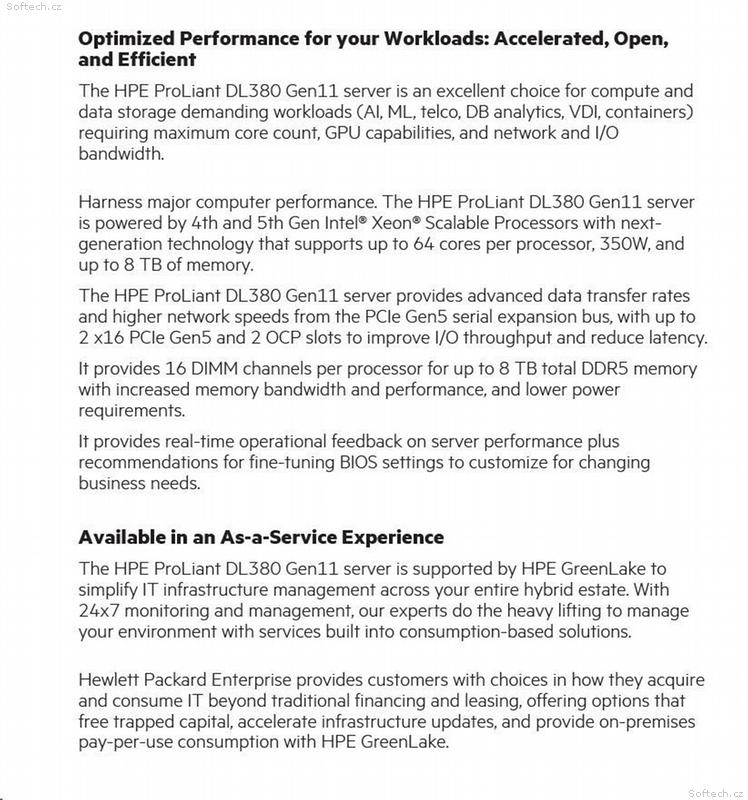 Server HPE ProLiant DL380 Gen11 využívá špičkové technologie a tak nabízí vysokou flexibilitu a výkon pro různé aplikace a použití.