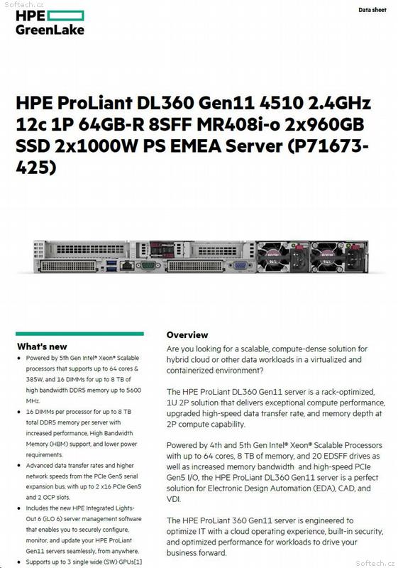 Server HPE ProLiant DL360 Gen11 nabízí koncentrovaný výpočetní výkon ve formátu 1U a nezbytnou odolnost vůči selhání. Je ideální pro prostorově omezené instalace.