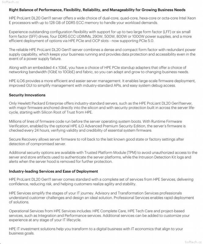 Server HPE ProLiant DL20 Gen11 je nízko nákladový model základní řady určený pro použití v racku. Nízké náklady, vysoký výkon.