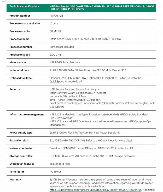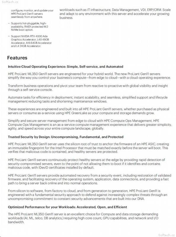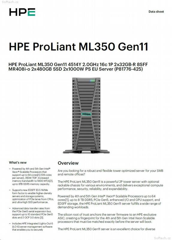 Server HPE ProLiant ML350 Gen11 poskytuje bezpečný věžový server s výkonem, rozšiřitelností a ověřenou spolehlivostí, což z něj činí volbu pro rozšiřování malých a středních podniků, vzdálených kanceláří větších podniků a podnikových datových center.