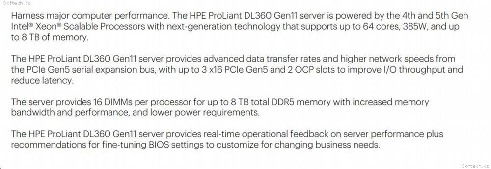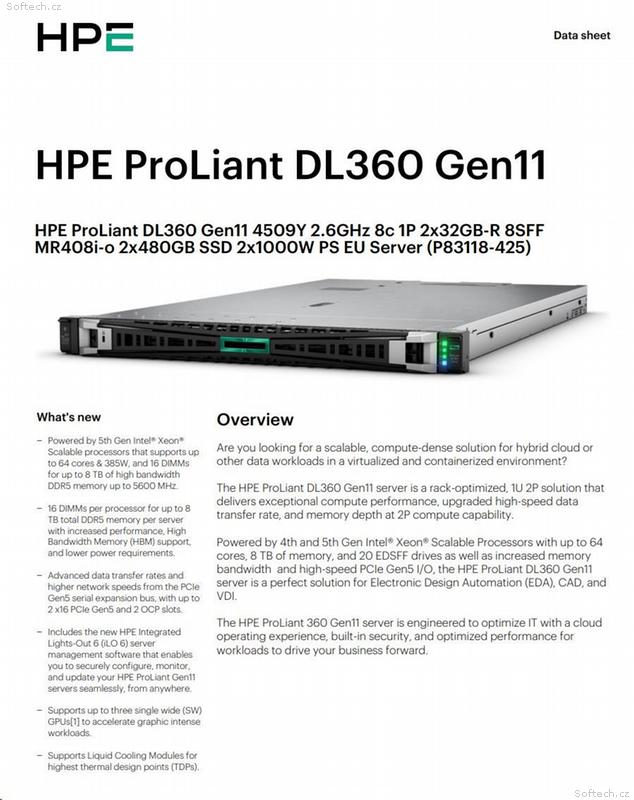 Server HPE ProLiant DL360 Gen11 nabízí koncentrovaný výpočetní výkon ve formátu 1U a nezbytnou odolnost vůči selhání. Je ideální pro prostorově omezené instalace.