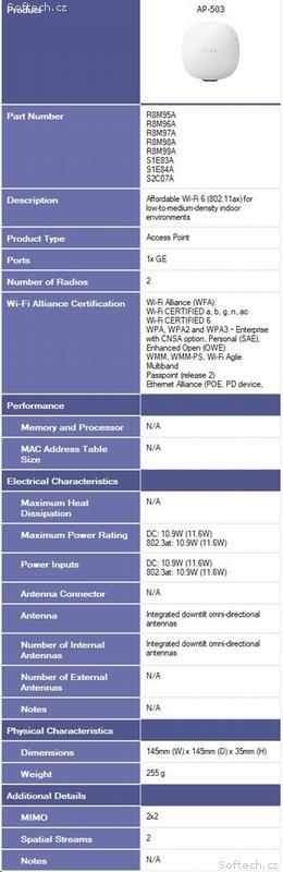 Aruba APs can be managed using cloud-based or on-premises solutions for any campus, branch, or remote work environment. As the management and orchestration console for Aruba ESP (Edge Services Platform), Aruba Central provides a single pane of glass for overseeing every aspect of wired and wireless LANs, WANs, and VPNs. AI-powered analytics, end-to-end orchestration and automation, and advanced security features are built natively into the solution. The 503 Series APs can also be deployed using HPE Greenlake for Aruba for flexible consumption and financing options.