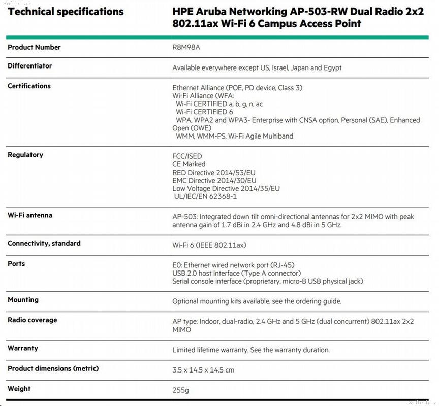 5x HPE Aruba Networking AP-503-RW Dual Radio 2x2:2 802.11ax Wi-Fi 6 Campus Access Point ( 5x R8M98A )