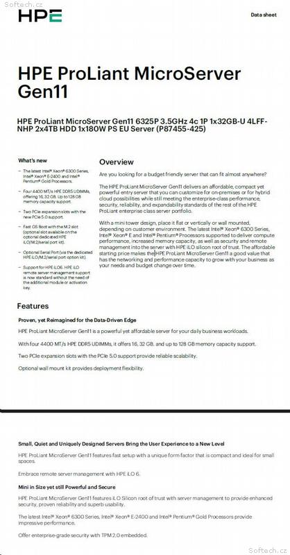 Server HPE ProLiant MicroServer Gen11 je serverem pro obecné použití, který nabízí platformu k organizaci a zabezpečení vašich podnikových informací, zajištění efektivní komunikace se zákazníky a k co nejlepšímu využití vašeho kancelářského vybavení a zdrojů. HPE MicroServer je cenově výhodný server pro začínající podniky s méně než 10 klienty, který pozvedne produktivitu a efektivitu vaší firmy na vyšší úroveň.