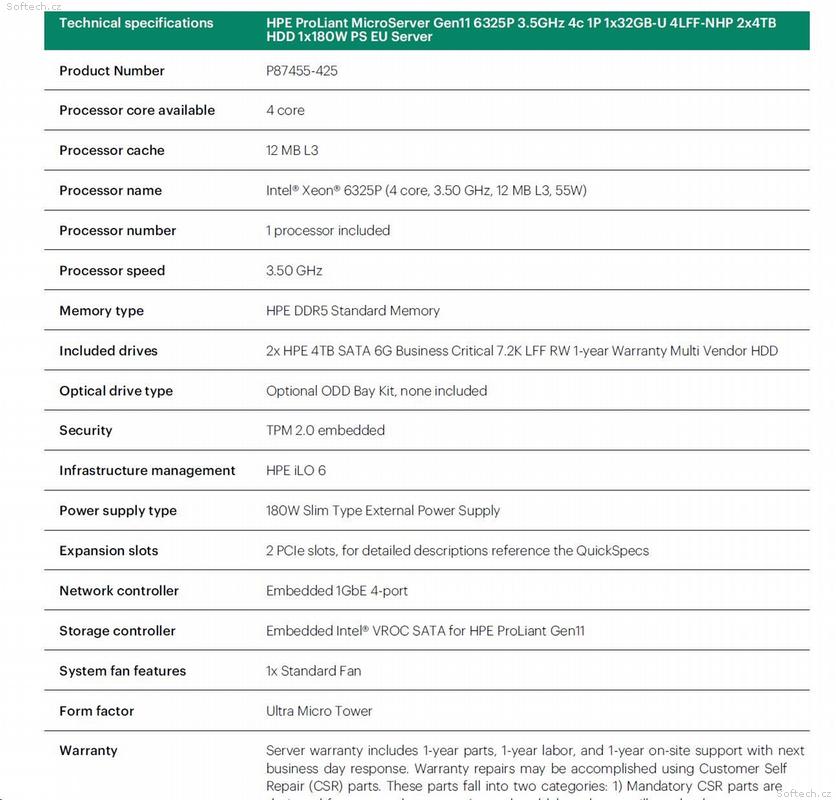 Záruka: 1 rok díly, 1 rok práce, 1 rok on-site, odezva následující pracovní den.