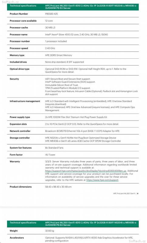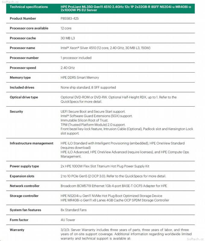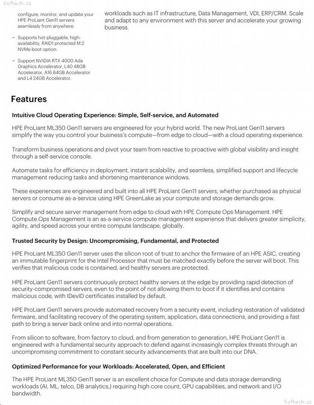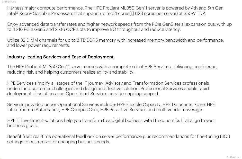 Server HPE ProLiant ML350 Gen11 poskytuje bezpečný věžový server s výkonem, rozšiřitelností a ověřenou spolehlivostí, což z něj činí volbu pro rozšiřování malých a středních podniků, vzdálených kanceláří větších podniků a podnikových datových center.