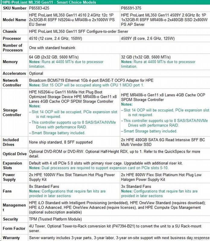 • HPE ML350 G11 4510, 64GB, 2 x 480GB NVME, MR408i-o