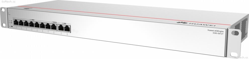 Huawei S380-S8T2T je router, který svým výkonem dokáže obsloužit až 300 uživatelů. Disponuje (2) Gbit WAN portem a (8) Gbit LAN porty pro připojení zařízení v místní síti. Rackmount provedení, které se napájí přímo z elektrické sítě 230V AC. Díky spotřebě maximálně 10,55W není potřeba aktivního chlazení, proto je router bez ventilátoru.