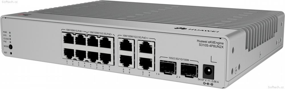 Huawei S310S-4P8UN2X je spolehlivý managovatelný cloud L2+ PoE switch s kapacitou přepínání 88Gbps, (4) Gbit PoE+ porty, (4) 2.5G PoE+ porty, (4) 2.5G PoE++ porty a (2) SFP+ sloty. Switch podporuje správu přes lokální webové rozhraní i cloudovou správu (eKit SNC / eKit mobilní aplikace). Maximální spotřeba energie zařízení je 25,9W (bez PoE zátěže).