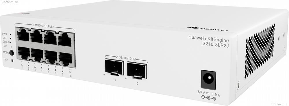 Huawei S210-8LP2J je spolehlivý managovatelný cloud L2 PoE switch s kapacitou přepínání 26Gbps, (8) Gbit PoE+ porty a (2) 2.5G SFP sloty. RJ45 porty podporují PoE+ s budgetem 32W. Switch podporuje správu přes lokální webové rozhraní i cloudovou správu (eKit SNC / eKit mobilní aplikace). Maximální spotřeba energie zařízení je 15,6W (bez PoE zátěže).