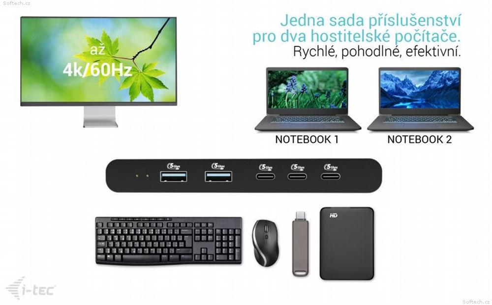 Kompaktní dokovací stanice s integrovaným KVM přepínačem pro efektivní práci se dvěma počítači současně.