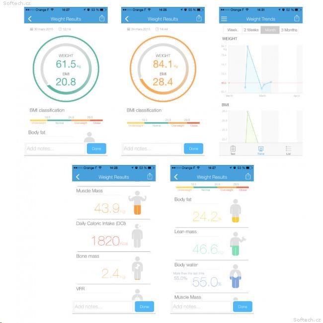 Měří 9 údajů (hmotnost, BMI, podíl netučné, kostní, svalové a vodní hmoty, tělesný a útrobní tuk, kalorický příjem)