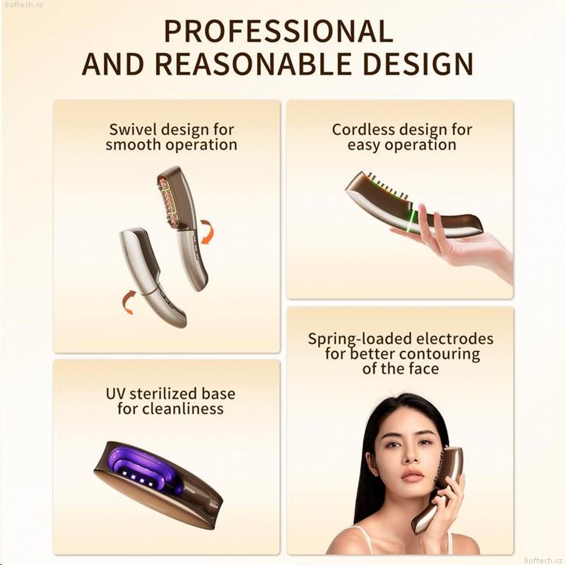 Prémiový design a hygiena: Otočná hlavice , pružinové elektrody a bezdrátové provedení s UV dezinfekční základnou.