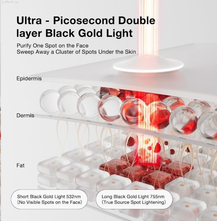 Režim WHITEN (Bělení skvrn): Cíleně se zaměřuje na tmavé pigmentové skvrny, pihy a stopy po akné. Energie je pohlcena nahromaděným melaninem, který se teplem rozloží na menší částečky a tělo je následně přirozeně odbourá. Skvrny tak postupně blednou a stávají se méně viditelnými.