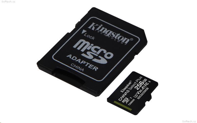 Kingston Canvas Select Plus - Paměťová karta flash (adaptér microSDXC na SD zahrnuto) - 256 GB - A1, Video Class V30, UHS Class 3, Class10 - microSDXC UHS-I
