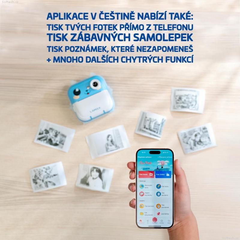 Foťák je propojený s chytrou aplikací v češtině, takže jeho ovládání zvládnou i menší děti. Aplikace toho ale umí mnohem více. Kromě tisku fotek, poznámek nebo samolepek přímo z telefonu zvládá i skenování ručně psaných zápisků, překlady textů z obrázků, AI vybarvování, tvorbu obrázků pomocí umělé inteligence nebo převod fotografií do animovaného stylu. Stačí pár kliknutí a děti si samy vytvoří obrázky přesně podle své představivosti.